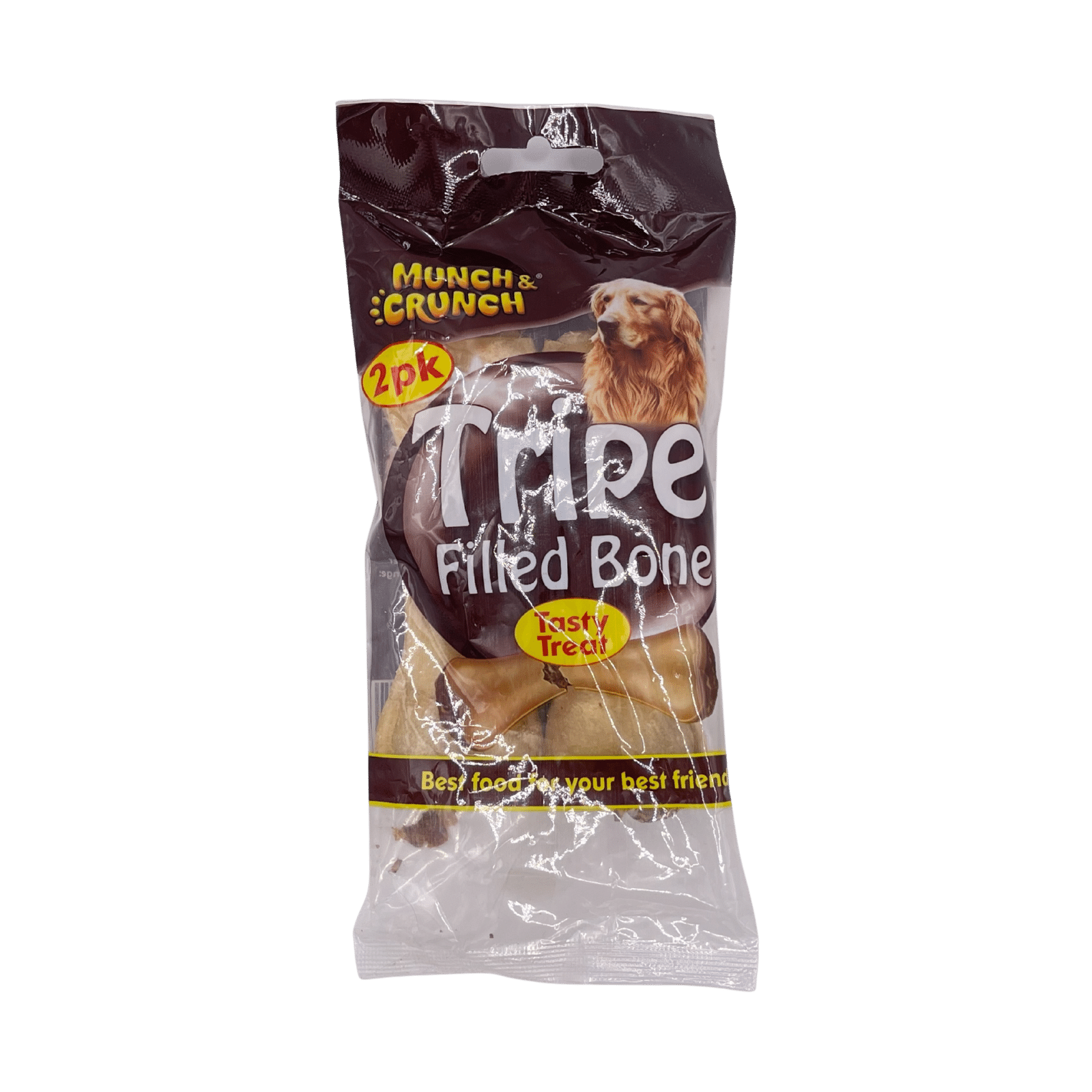 Munch & Crunch Tripe Filled Bone Dog Treats – 2 Pack contains two tasty chew bones designed to satisfy your dog’s natural chewing instinct while delivering a rewarding treat. They are ideal for keeping dogs happily occupied, supporting positive behaviour, and adding variety to everyday routines.
