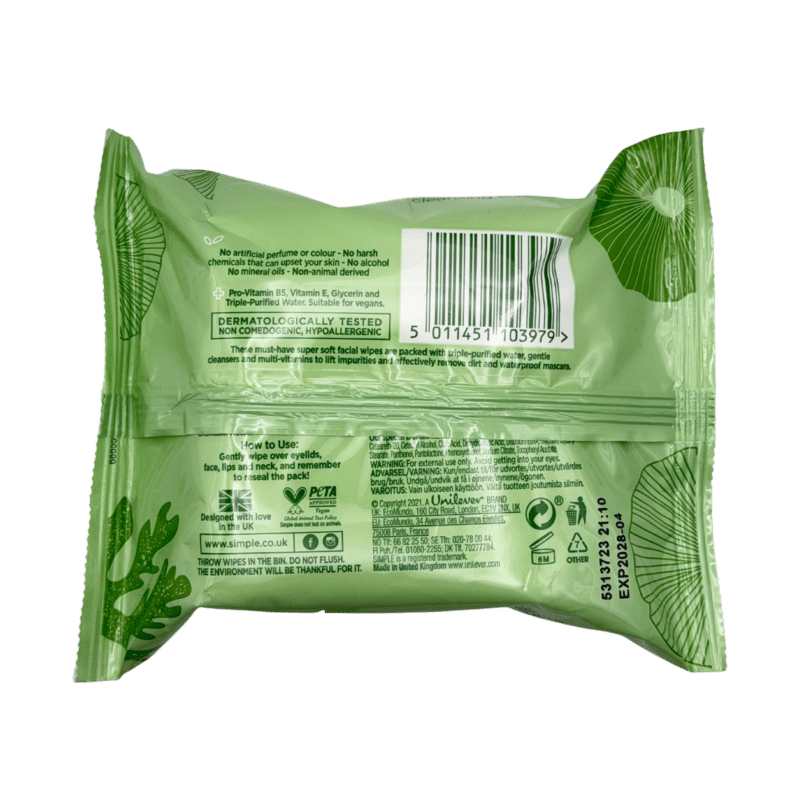 Simple Kind to Skin Cleansing Wipes for Sensitive Skin 25 Wipes offer a quick and gentle way to cleanse your face, removing makeup and everyday impurities in seconds. Designed for delicate skin, they leave your face feeling fresh, calm, and comfortable without rinsing.